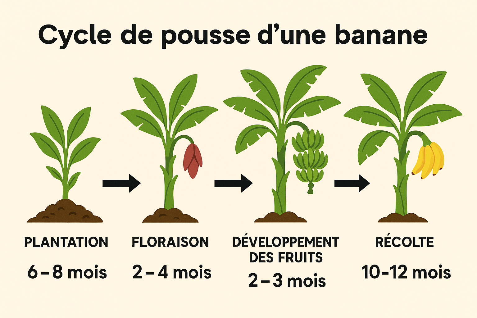 Après environ 7 à 15 mois de croissance végétative, selon la variété et les conditions climatiques, le bananier entre dans sa phase de reproduction.